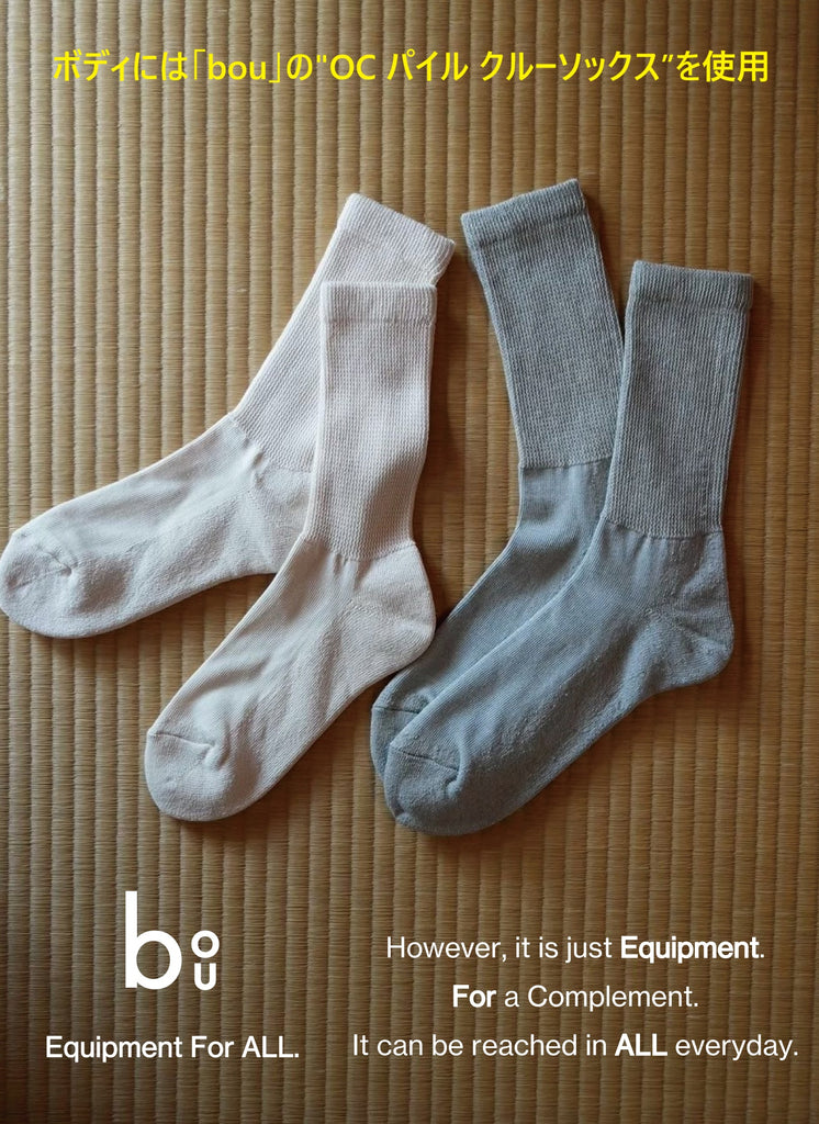 ※履き心地、素材にこだわったbouのオリジナルソックス。表糸に全てオーガニックコットンを使用しており通常のコットンよりも柔らかさがあります。底をパイルにし、クッション性を加えており更に履き口の締め付けを極力抑えることで、足にストレスのかからない履き心地を目指しました。